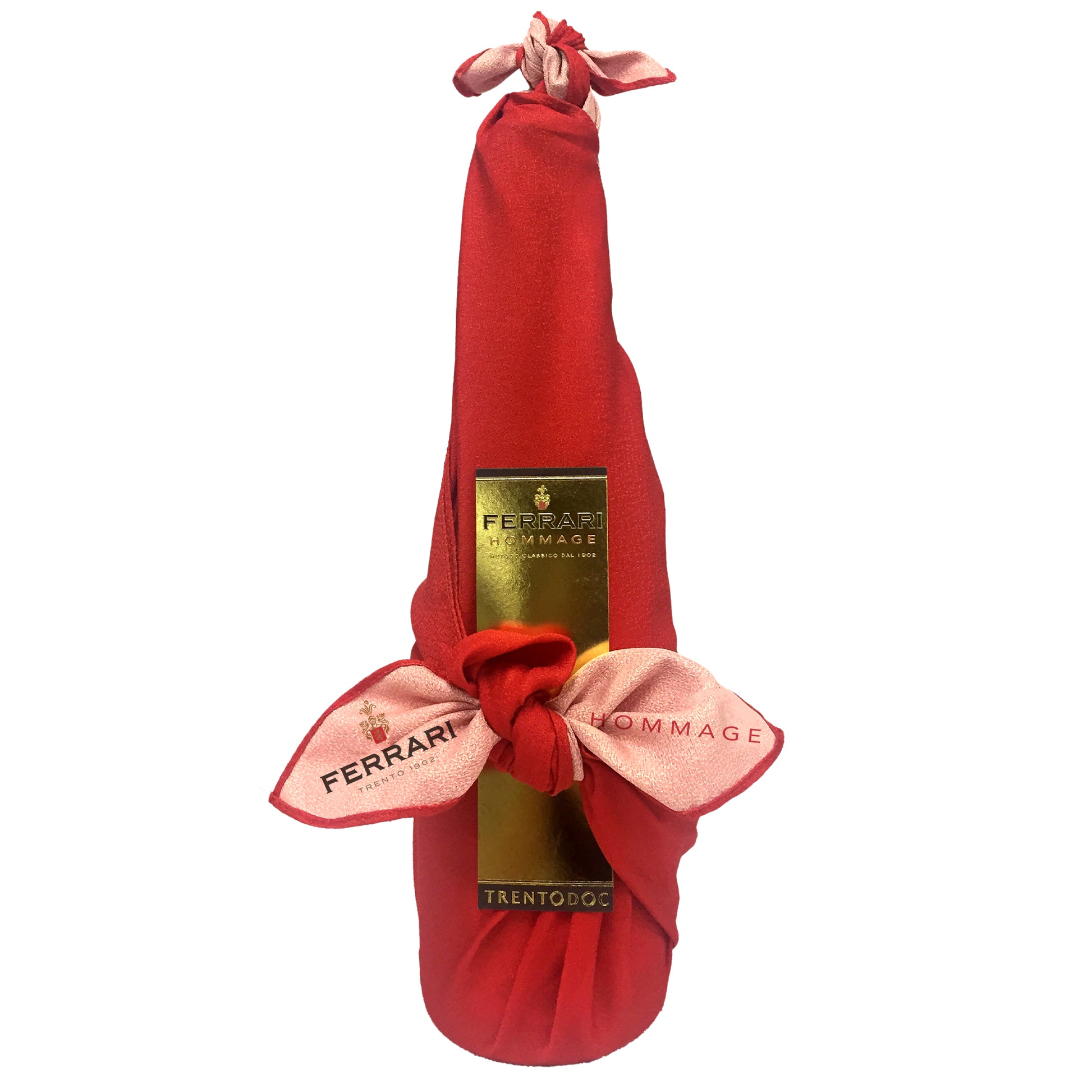 フェッラーリ社が日本へ、長年の友情に感謝と敬意(オマージュ)を込めて造った、世界で唯一の特別な逸品。エチケットには日本で縁起の良いとされている、和風の美しい模様があしらわれ、華やかに日本を祝福しています。フェッラーリ・オマージュの華やかなデザインは、日本文化に関わる行事や、様々な慶事に最適で、もちろん繊細な味の和食にも完璧に寄り添います。日本とイタリアの友好を象徴する特別な品です。美しい紅色の風呂敷に包まれたフェッラーリ・オマージュ。慶事の贈り物として、お持たせとして、和の場面にも喜ばれる品です。(メトド・クラッシコ製法)